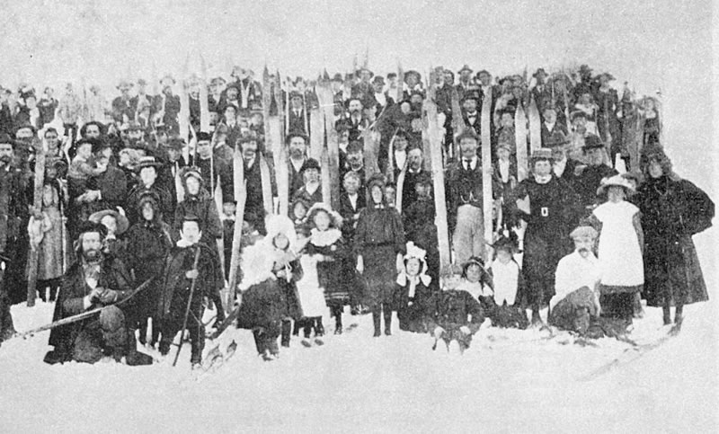 This fifth instalment of ski heritage photos takes you back 110 years in New South Wales, when skiing was something done by the 270 miners and their families at Kiandra, who were joined for the Snow Shoe Races by about 50 visitors from other parts of the Monaro and Sydney (Photo 1). Kiandra in winter was completely isolated by deep snow drifts from the rest of NSW and winter visitors often had to ski 15km to get there. Some of these ski enthusiasts successfully pressed the NSW Government to establish a more easily accessible ski resort on the eastern side of the Kosciusko Main Range. Many thousands were introduced to skiing in the period 1909 to 1951 at the Hotel Kosciusko and the Chalet at Charlottes Pass. Closely associated with these two large hotels were three huts – Betts Camp, Seamans Hut and Whites River Hut. This instalment also looks at two skiers who not only significantly raised community awareness as to the vast extent and quality of the snowfields in the Snowy Mountains, but also greatly influenced government to actively develop these snowfields. The first is Charles Kerry (1858 – 1928) whose historic Kiandra skiing photos are well known.