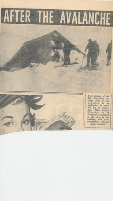 In 1956 work began restoring the derelict Pounds Creek Hut, upstream from Guthega and it opened as Illawong Lodge. During the winter of 1956, Kunama was destroyed by an avalanche, with the loss of one life (Roslyn Wesche). Three weeks later the Northcote Tow Hut burned down. The park authorities would not allow re-building on the Main Range and as planning for Thredbo Village was just starting, the insurance money was used to start Roslyn Lodge using a barrack hut from the Guthega Dam construction site. A newer Roslyn Lodge was built in 1976.